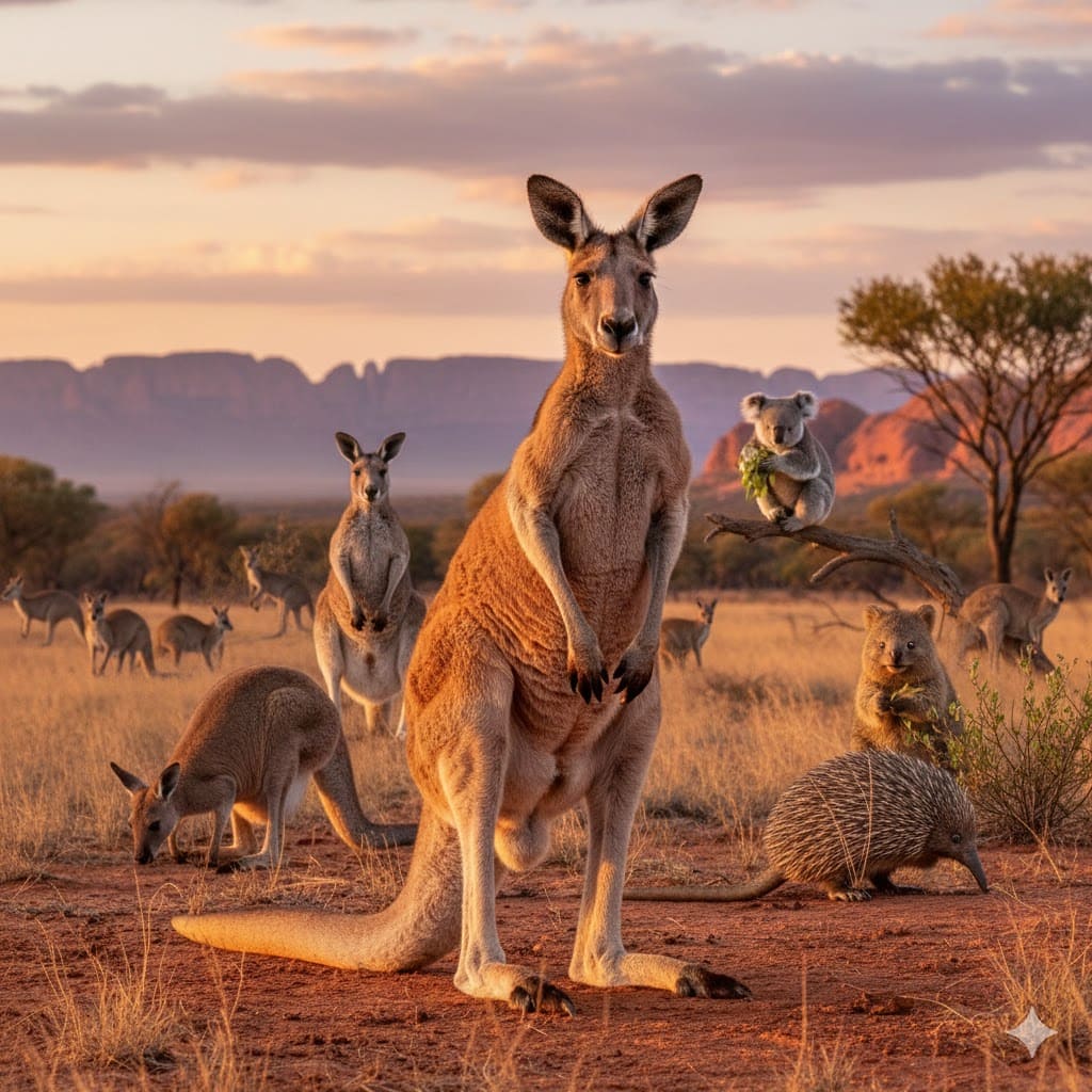 Le kangourou est sans conteste l’animal emblématique de l’Australie, également présent en Nouvelle-Guinée. En tant que plus grand des marsupiaux, il fascine par sa capacité à bondir à des vitesses allant jusqu’à 70 km/h. Ses pattes puissantes lui permettent d’effectuer des sauts impressionnants de 3,3 mètres de hauteur et jusqu’à 9 mètres de longueur. Bien qu’il dispose d’une force physique remarquable, il reste vigilant face aux prédateurs tels que le dingo et les crocodiles. Ce marsupial est un symbole fort du pays et représente une attraction majeure pour les touristes.